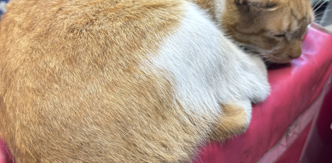 夜市閒晃看到攤位旁的小板凳上蜷著的貓咪